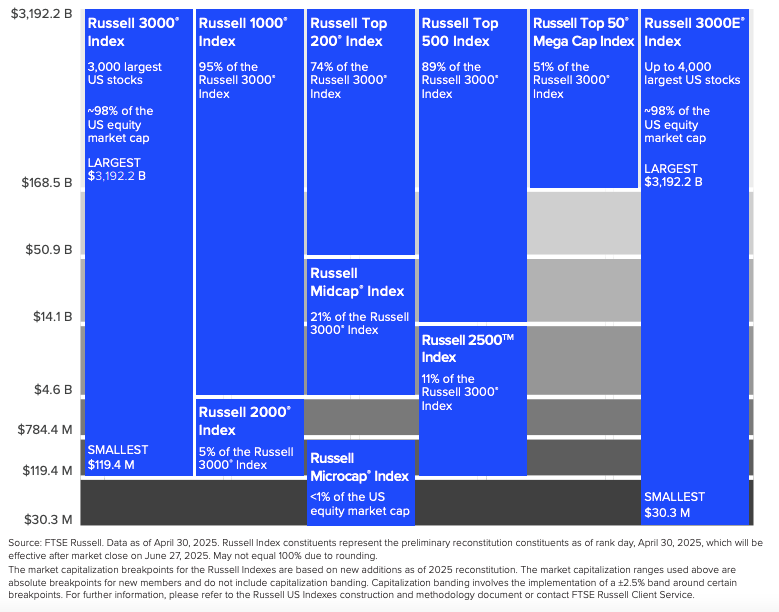 - Russell 3000 Index: This broad cap index of the top 3,000 US stocks by market cap was designed to cover approximately 98% of the US equity investable universe.