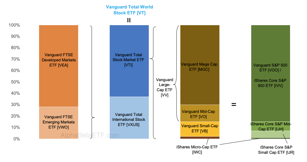 As an overview, Vanguard Total World Stock ETF [VT] , which provides coverage of Global Blend Cap stocks, can be decomposed into other ETFs by market cap, regions and markets as below: