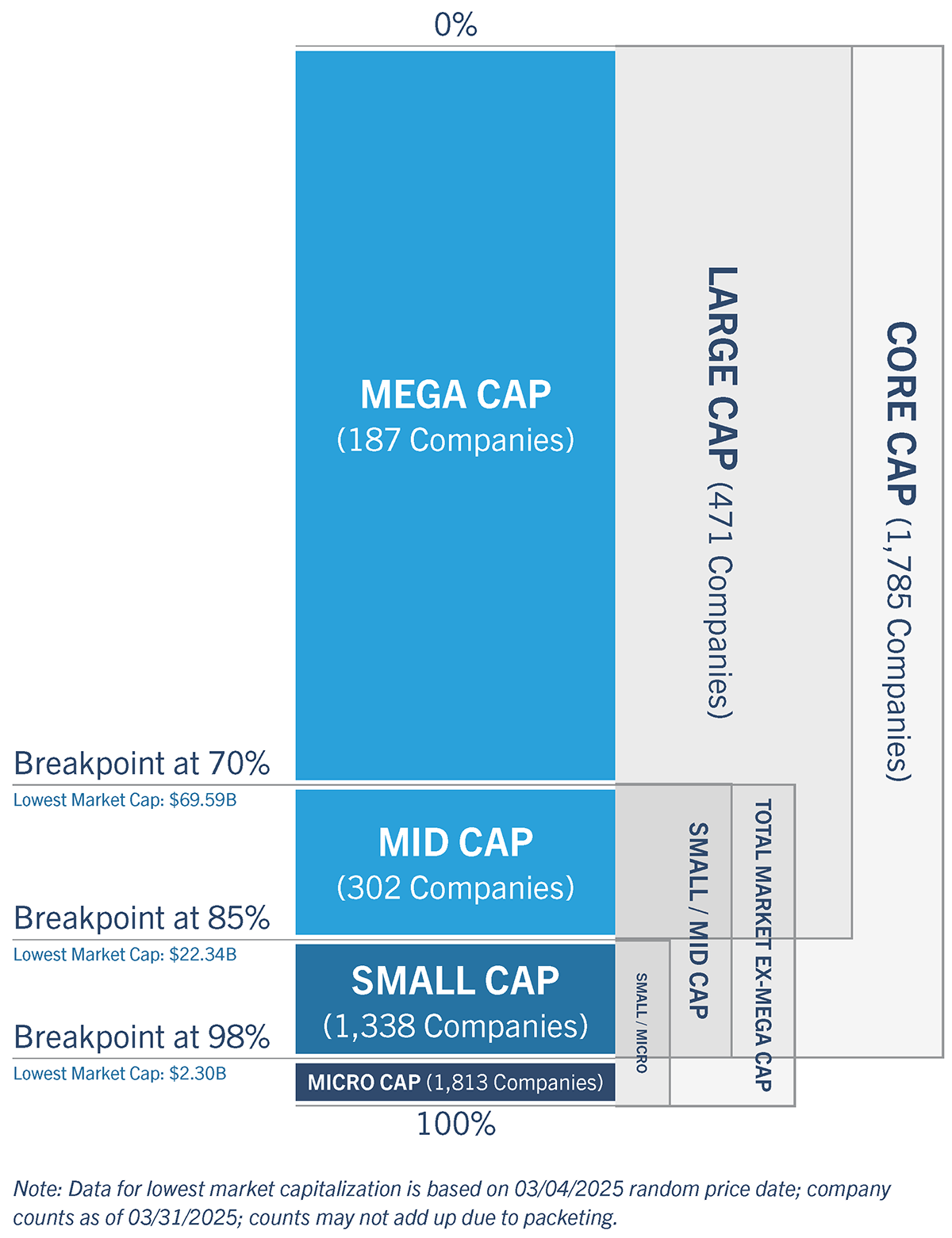 - Russell 2000 Index: The next 2,000 largest stocks by market cap, the index comprehensively covers the small cap opportunity set.